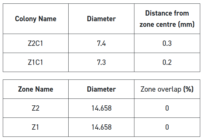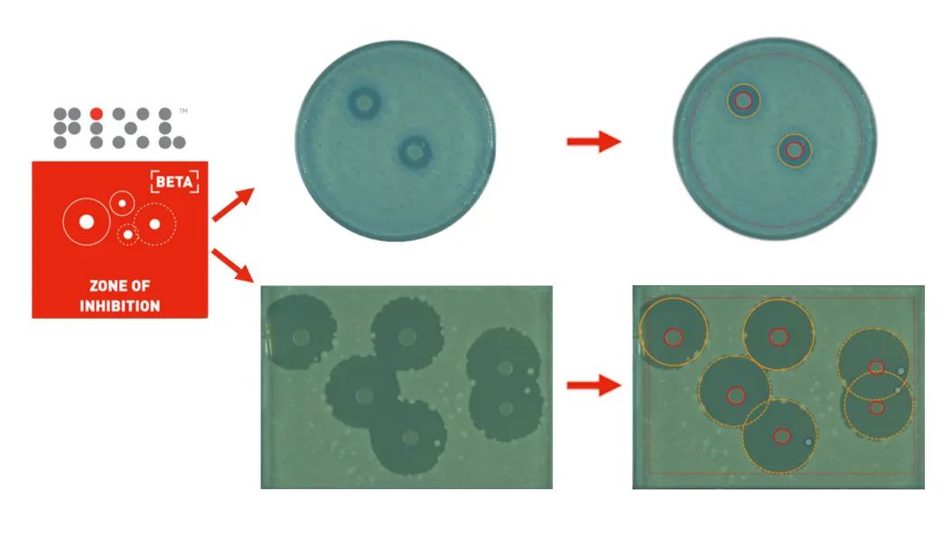 P-ZOI可以檢測直徑為2至9mm抑菌圈內(nèi)的中心菌落,并且可以檢測直徑為8至80mm的抑菌圈,與其他抑菌圈重疊(按半徑計算)高達(dá)40%。 通過自動檢測抑菌圈,PIXL無需人工測量,最大限度地減小人為誤差,并具有更好的樣品和分析數(shù)據(jù)之間的可追溯性。