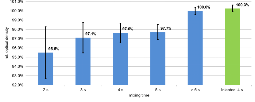 但振蕩器對(duì)于稀釋體系的振動(dòng)幅度遠(yuǎn)不如反復(fù)吹打,若想達(dá)到100%混勻程度,唯一的方法就是延長振蕩時(shí)間,這種方式將顯著降低實(shí)驗(yàn)操作的速度。