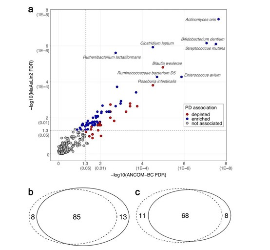 研究發(fā)現(xiàn)在帕金森病患者中,絕大部分厭氧菌包括齒雙歧桿菌(Bifidobacterium dentium),粘性放線菌(Actinomyces oris),變形鏈球菌(Streptococcus mutans)其豐度都增加了6-7倍,相應(yīng)的像腸道羅斯拜瑞氏菌(Roseburia intestinalis),Blautia wexlerae 豐度都減少了5-7倍,總體而言,36%的與帕金森病相關(guān)的腸道微生物群豐度變化超過(guò)2倍。Haydeh Payami 表示,這項(xiàng)研究建立了迄今為止最高分辨率的帕金森病腸道微生物組大型數(shù)據(jù)庫(kù),隨著樣本量的增加,以及其他研究團(tuán)隊(duì)進(jìn)行的宏基因組研究,將會(huì)有更多信息被揭示。