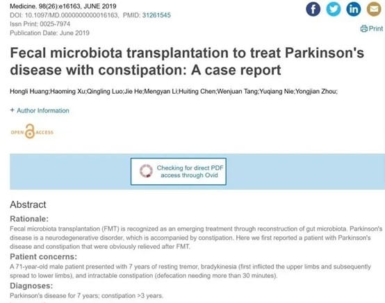 近年,在SCI期刊《Medicine》(《醫(yī)學(xué)》)也收錄了一個(gè)病例,患者為了解決多年便秘的困擾,通過(guò)腸道菌群移植的治療,不僅改善了多年頑疾便秘,也大大改善了帕金森癥狀。治療表明腸道菌群對(duì)中樞神經(jīng)系統(tǒng)能產(chǎn)生相應(yīng)影響,通過(guò)菌群移植可重建腸道微生態(tài)平衡,這項(xiàng)技術(shù)有望為更多帕金森病患者帶來(lái)福音。
