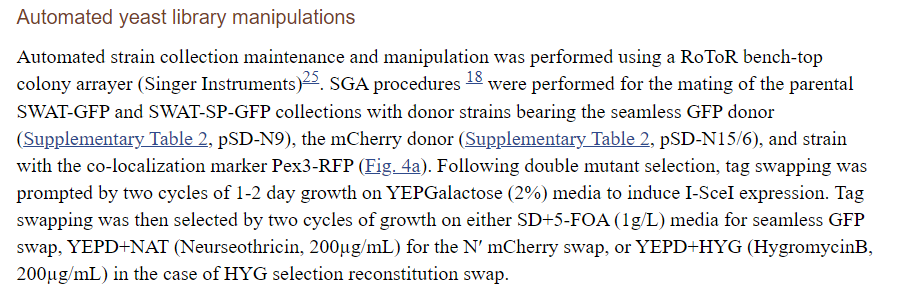 這種方法的瓶頸是雜交和篩選的步驟。Schuldiner和Knop實(shí)驗(yàn)室使用Singer Instruments公司的ROTOR來(lái)突破這些瓶頸。因此,用ROTOR處理菌株,雜交、產(chǎn)孢,標(biāo)簽交換篩選/計(jì)數(shù)篩選、被用來(lái)處理所有的應(yīng)變,交配和產(chǎn)孢程序,標(biāo)簽交換選擇/反選擇,以及在文庫(kù)中篩選成功的集成模塊。