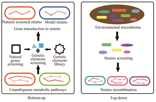自下而上”的方法需要明確微生物的代謝路徑,對功能基因元件進行篩選和改造,并將其整合到合適的菌株中。菌株可從自然界篩選得到,也可通過對模式微生物進行改造從而得到滿足特殊的功能需求的菌株?;蛟梢詠碜砸褕蟮赖脑?,也可以自行篩選獲取。針對合成微生物組所需要執(zhí)行的特定生物功能,根據(jù)現(xiàn)有的微生物代謝庫,查明其代謝通路,明確代謝通路中涉及的基因,在不同宿主中篩選相關(guān)的基因元件,整合到合適的底盤微生物中,使其具備相應(yīng)的功能。